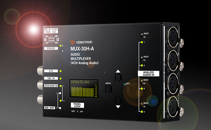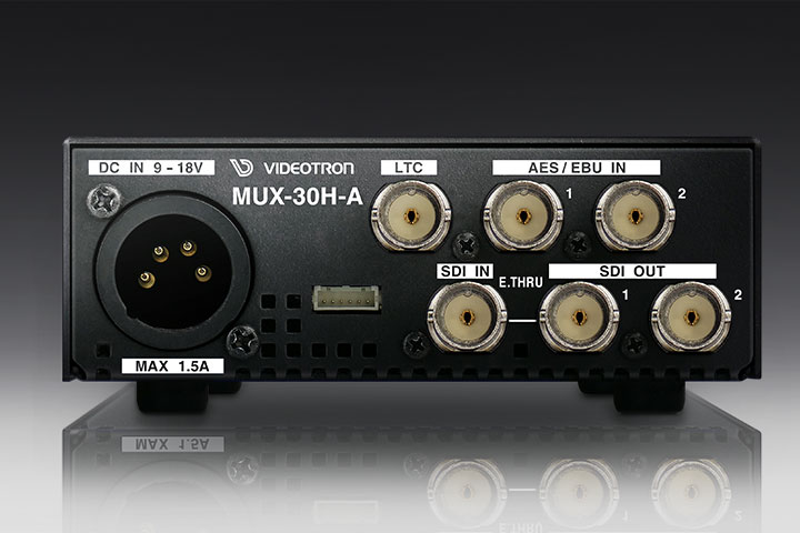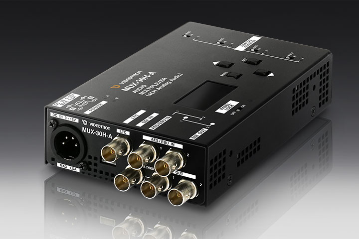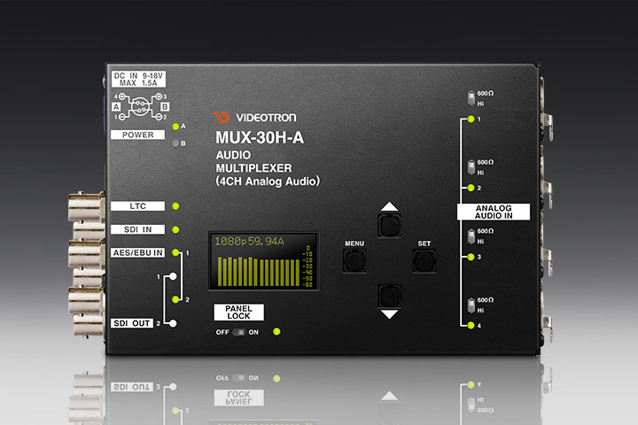 MUX-30H-AはHD-SDIと3G-SDI(Level-A)に対応した音声マルチプレクサーで、SDI信号にAES/EBU、ANALOGを重畳します。同期方式はラインロックで、対応フォーマットは、1080i60/59.94/50, 1080p30/29.97/25/24/23.98,1080sF30/29.97/25/24/23.98, 1080p60A/59.94A/50Aです。入力SDI信号のエンベデッド音声16chとAES/EBU(2系統4ch)、ANALOG(4ch)を組み替えるリマッピング機能、音声レベルの調整機能、音声遅延機能を提供します。