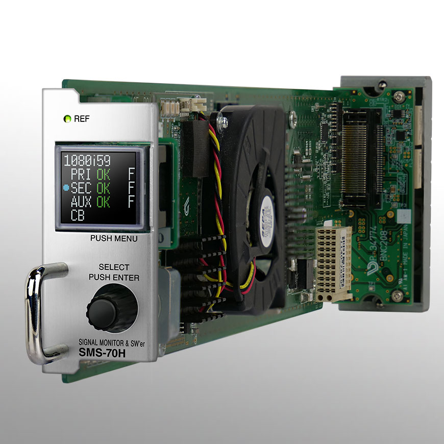 入力信号の監視を行い、エラーを検出した際には自動で切替、アラームの発報をします。監視機能は現用、予備、AUXの3系統、FS機能を内蔵し、非同期の入力信号にも対応。エラーは黒味、無音、フリーズなど19種類を検出し、ショックレスで切替を行います。アラームは接点およびSNMPに対応。